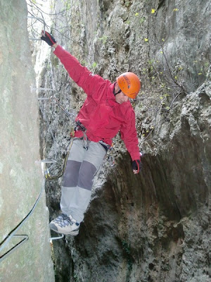 Como no llevábamos cuerda para rappelar, decidimos destrepar el camino andado para evitar tener que rodear todo el macizo, y una vez abajo a escasos metros de la primera, escondida entre un gran diedro de caliza encontramos el acceso a la segunda de las Vías Ferratas de este gran Macizo.